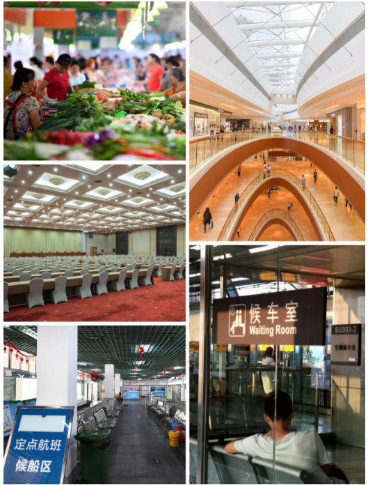 宾馆、饭店、商场、集贸市场、客运车站候车室、客运码头候船厅、民用机场航站楼、体育场馆、会堂以及公共娱乐场所等。